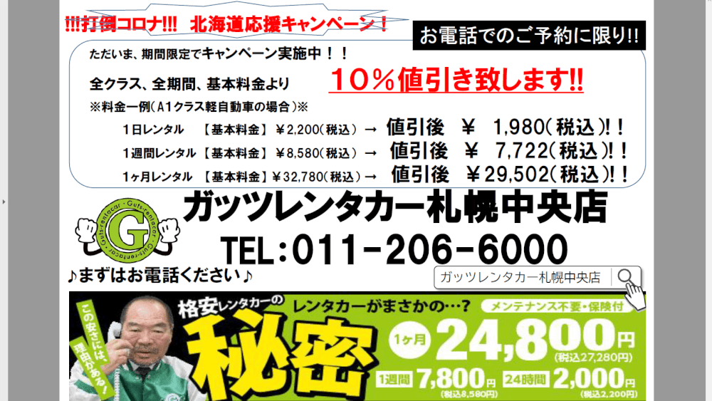 格安レンタカーのガッツレンタカー!GWや夏季、年末年始の営業情報や入庫車情報など、ガッツレンタカー 札幌中央店から皆様へのお知らせです。