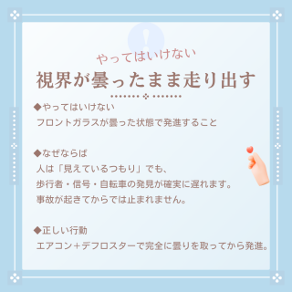 フロントガラスが曇った状態で発進すること。