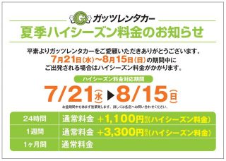ガッツレンタカー堺七道駅前店、夏季ハイシーズン料金のお知らせです。