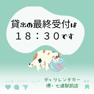 【堺・七道駅前店】貸出の最終受付は18:30です!