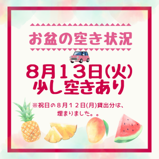 8月13日(火)貸出分は、まだ少しだけ空きあります!!