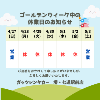 【堺・七道駅前店】ゴールデンウィーク休業日のお知らせ