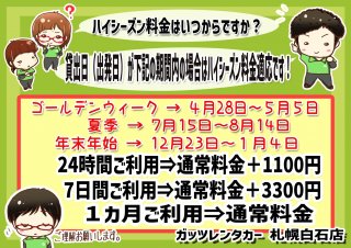 格安レンタカーのガッツレンタカー!GWや夏季、年末年始の営業情報や入庫車情報など、ガッツレンタカー 札幌白石店から皆様へのお知らせです。