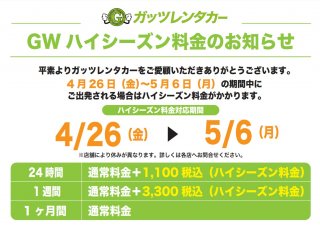格安レンタカーのガッツレンタカー!GWや夏季、年末年始の営業情報や入庫車情報など、ガッツレンタカー 高城駅前店から皆様へのお知らせです。