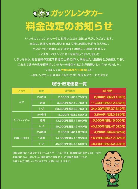 一部レンタカーの料金を下記のとおり改定させていただきます。