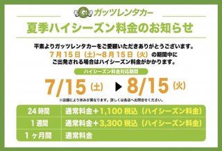 7月15日(土)~8月15日(火)の期間でのお貸出しは、ハイシーズン料金が適用になります。