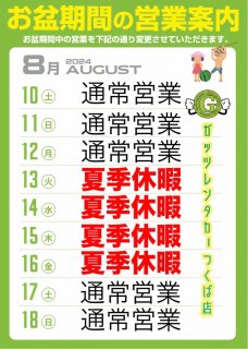 格安レンタカーのガッツレンタカー!GWや夏季、年末年始の営業情報や入庫車情報など、ガッツレンタカー つくば店から皆様へのお知らせです。