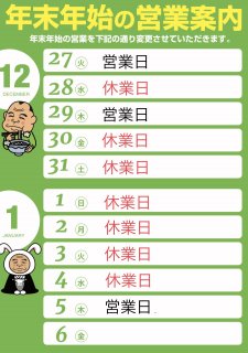 12月30日(金)~1月4日(水)まで休業日とさせていただきます。