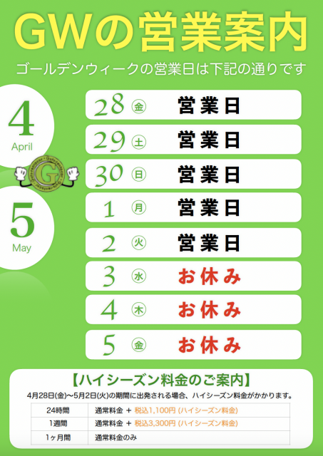 GW休業期間中は、貸渡・返却・電話受付の対応は致しかねます。